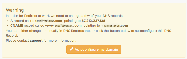 2. Click Manage next the domain name you wish to redirect from the list of domain names that appears. If you only have one domain name, your list will only show one item, but you still need to click Manage.