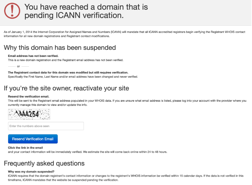 This suspension cannot be lifted by us or the registry, only by ICANN. ICANN will only remove the suspension when the domain verification has been completed. You can recognize ICANN suspensions in one of 2 ways; either by visiting the site and seeing the suspension notice page, or looking at the WHOIS details and seeing the ‘client hold’ status on the domain. See the pictures below for reference.